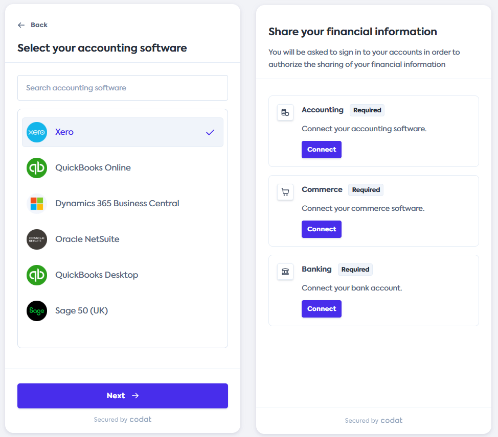 Our Hosted LinkLink The authorization flow that allows end users to connect their accounting, banking, or commerce platforms to your application via Codat. flow UI has been updated with a cleaner layout and now allows users to connect their integrations in any order.